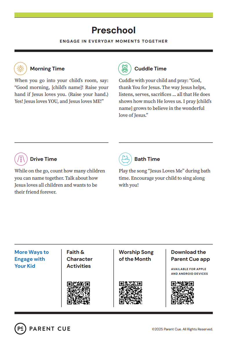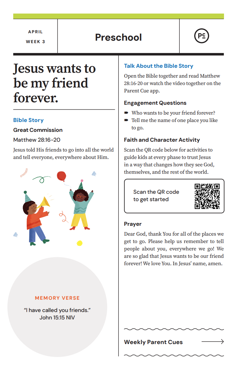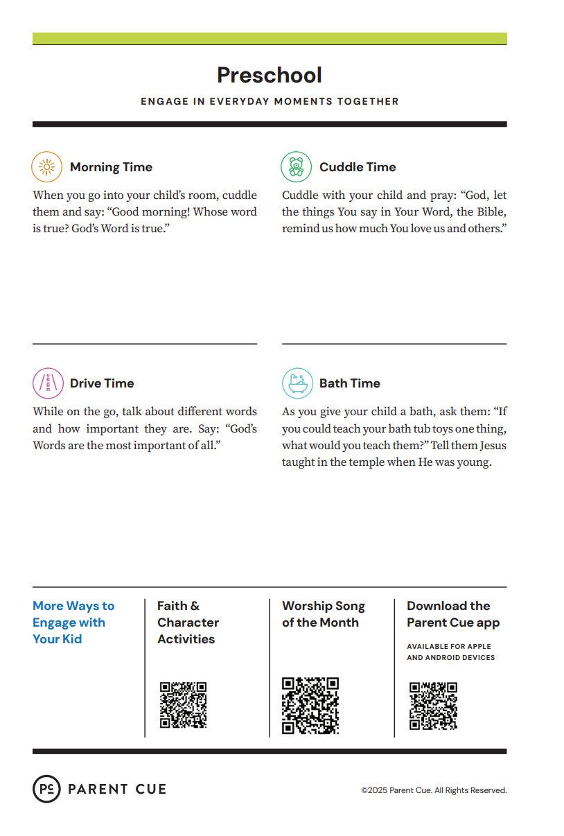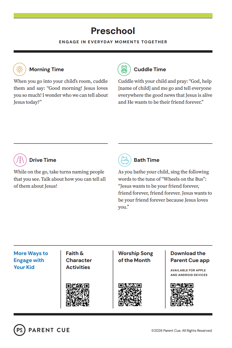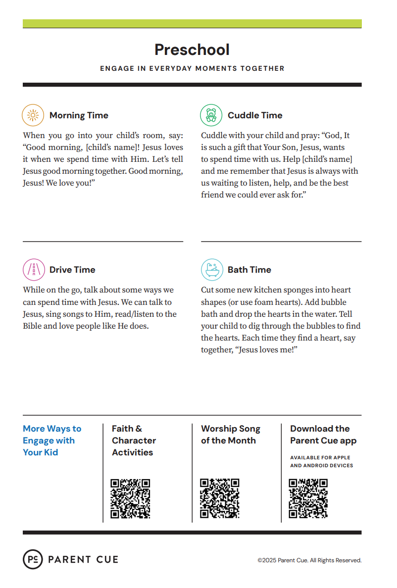After you have completed the Check-In process & taken your child to his or her room, wave a quick good-bye & head into the adult worship service! As you know, it is common for little ones to cry when a parent leaves, and if this happens our volunteers will immediately engage your child in a toy or activity and ensure your child that you will return soon. If your child cries for an extended period of time or needs you for some reason, we will put your parent/guardian code on the top right hand corner of the auditorium screen!